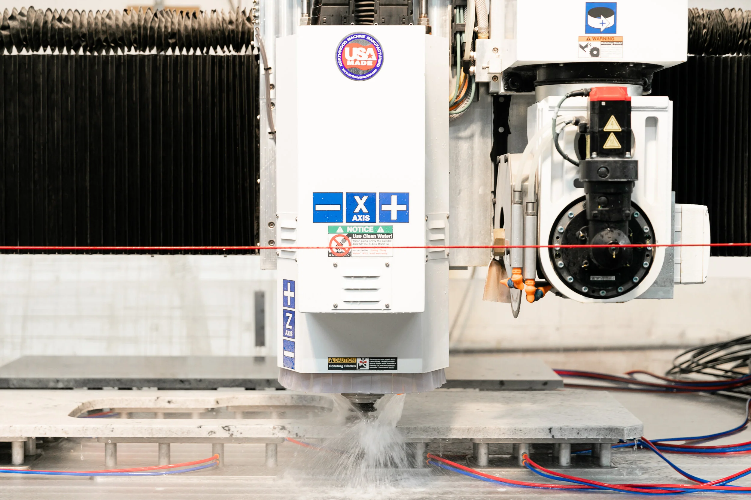 Our CNC Sawjet uses both a Saw blade and a 50,000 psi stream of water to physically cut the stone to size. We cut the stone a little oversize so that our CNC stone router can precisely mill and final shape each profile. The CNC Sawjet is the very latest technology. It uses a camera system to align and position the digital versions of your counter-top upon the slab you have selected.